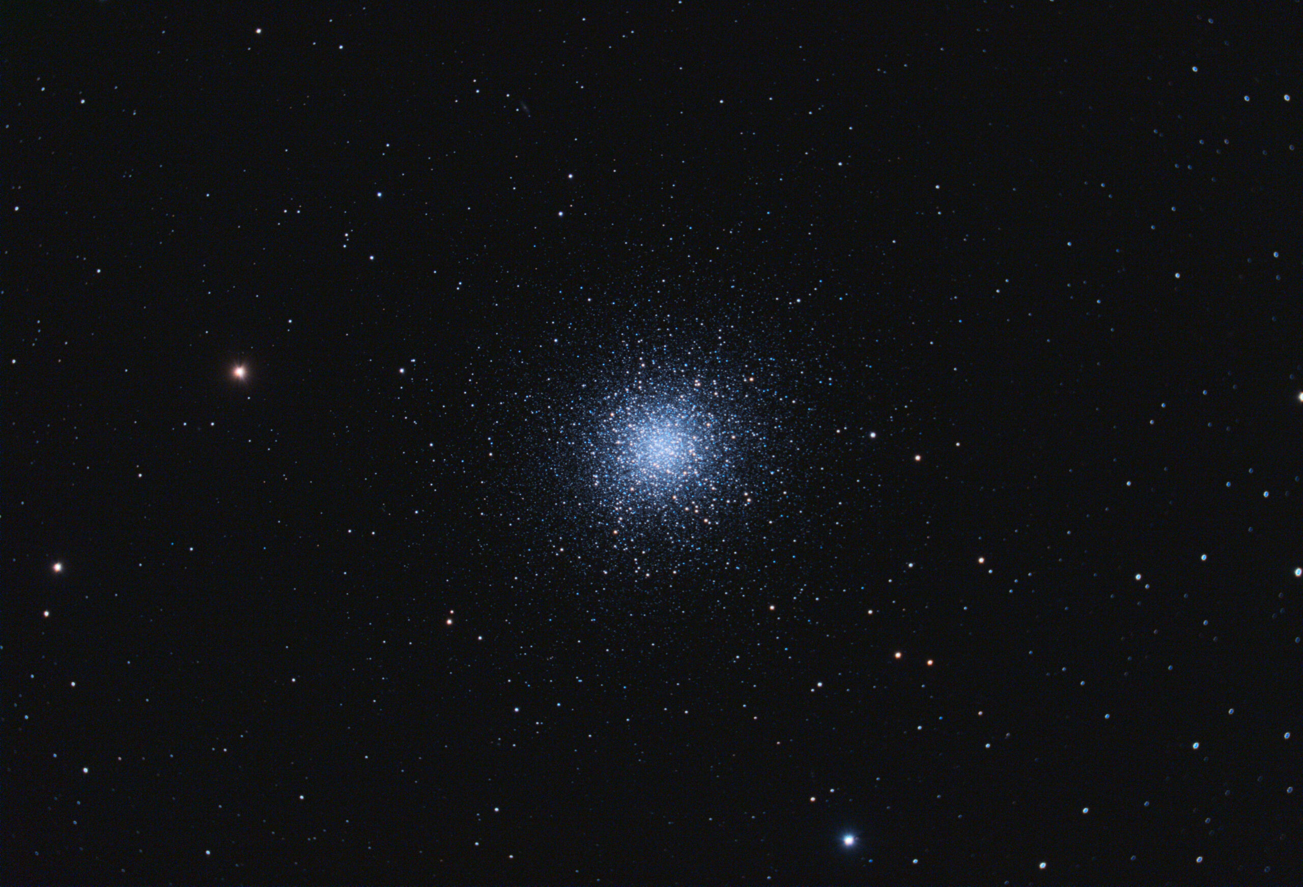 M13 (Messier 13), connu sous le nom de « Grand Amas d’Hercule », est l’un des amas globulaires les plus spectaculaires du ciel boréal. Situé dans la constellation d’Hercule à 25 000 années-lumière, il contient plus de 300 000 étoiles et mesure environ 145 années-lumière de diamètre. Sa magnitude de 5,8 le rend visible à l’œil nu par nuit claire.