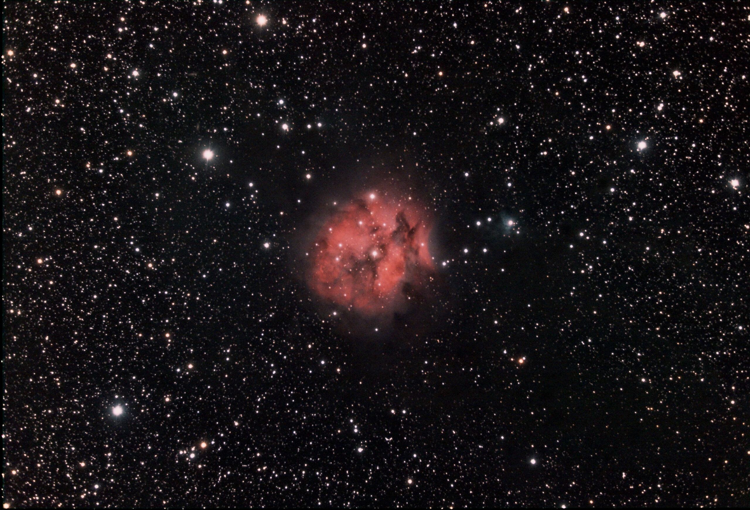 La région centrale présente une teinte rougeâtre caractéristique des nébuleuses d’émission d’hydrogène ionisé .