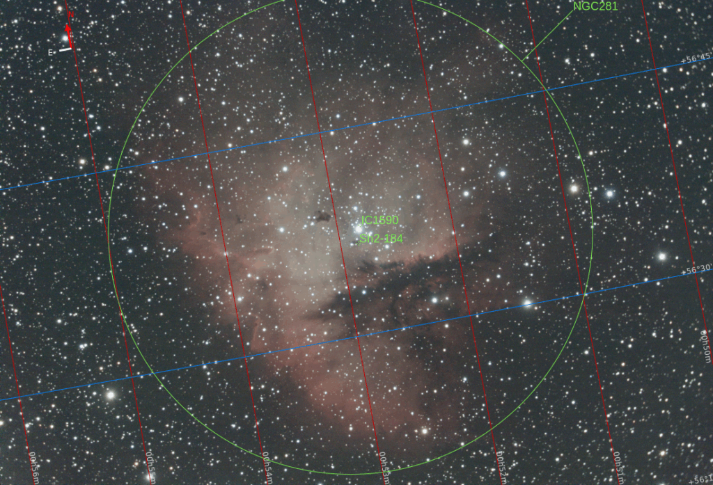 NGC 281 est une nébuleuse en émission, aussi connue sous le nom de nébuleuse Pacman en raison de sa ressemblance avec le personnage du jeu vidéo Pac-Man.