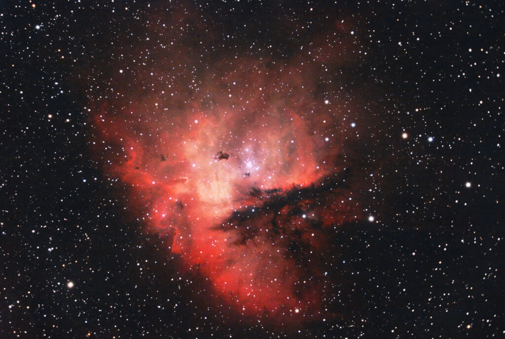 Dans NGC 281, on observe également des globules de Bok, qui sont des poches sombres de gaz et de poussières où se forment potentiellement de nouvelles étoiles. Ces structures apparaissent comme des taches sombres contrastant avec l’arrière-plan lumineux de la nébuleuse.