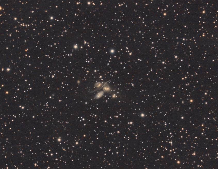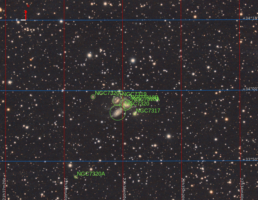 - NGC 7320 (spirale), est en réalité une galaxie d’avant-plan située à seulement 40 millions d’années-lumière, créant ainsi une illusion d’optique. Les quatre autres galaxies forment un véritable groupe physiquement lié.