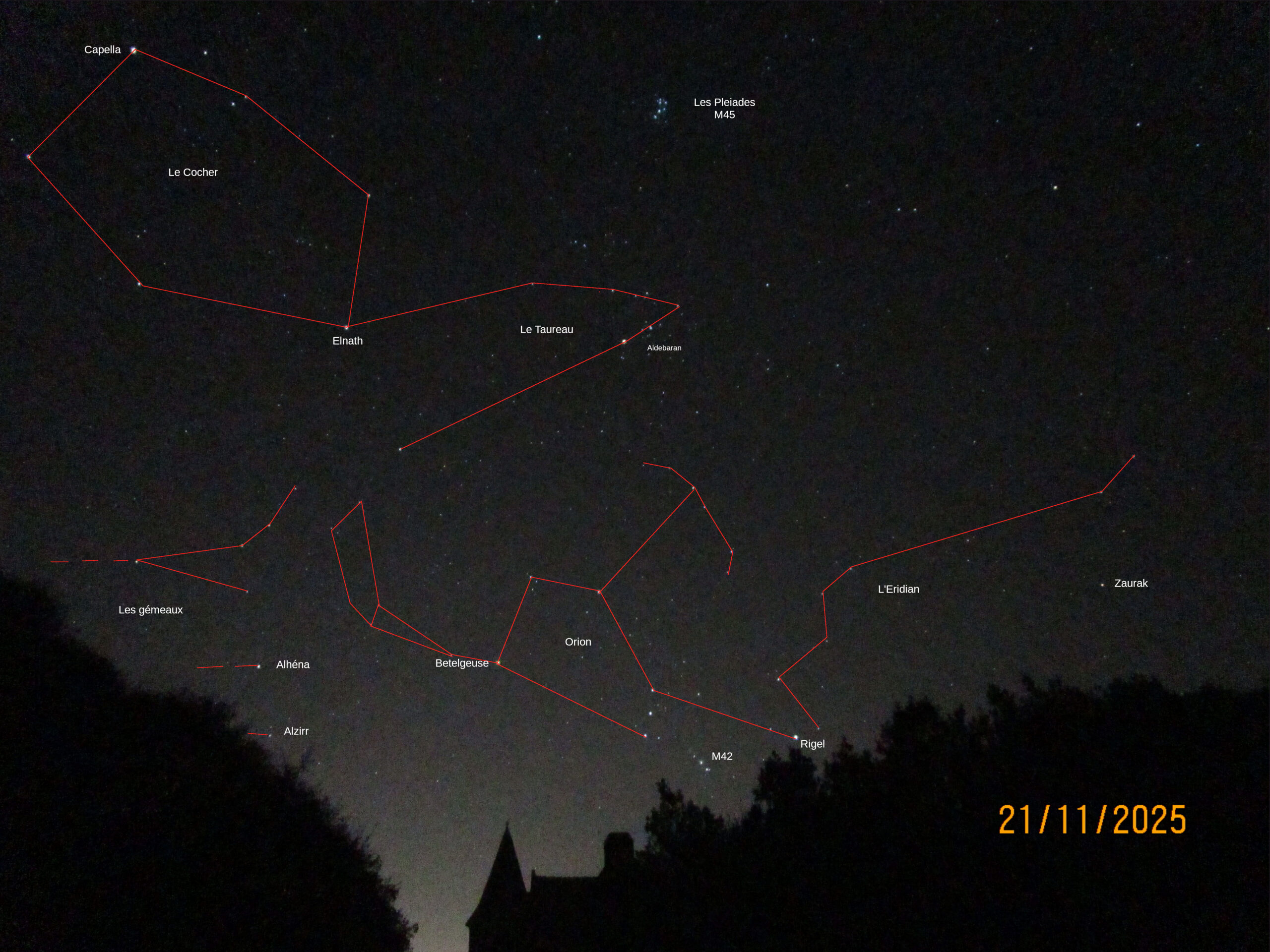 Le ciel du 21 novembre 2025 Auteur/autrice de la publication :Frere Jean-Marie Publication publiée :24 novembre 2025 Post category:Astrophotographie / ciel à l'oeil nu / constellations Commentaires de la publication :0 commentaire Jean Marie a saisi les constellations au sud sud est ,vers 22 h le 21 novembre. Une belle image qui nous rappelle que pour faire de l’astronomie,il suffit de lever les yeux au ciel Étiquettes: astronomie La Baule, astronomie presquile guérandaise, Constellation d'Orion, Constellation du Taureau, Orion Read more articles Article précédentNGC 772, galaxie asymetrique Article suivantM42, un nuage lumineux où naissent les étoiles. Vous devriez également aimer Les photos de Manon 23 janvier 2024 La nébuleuse du Voile 17 juillet 2023 Le lune du 17 mai 2024 21 mai 2024 Laisser un commentaire Annuler la réponseCommentEnter your name or username to comment Enter your email address to comment Saisir l’URL de votre site (facultatif) Enregistrer mon nom, mon e-mail et mon site dans le navigateur pour mon prochain commentaire. Δ