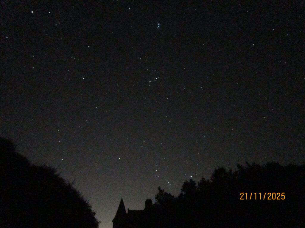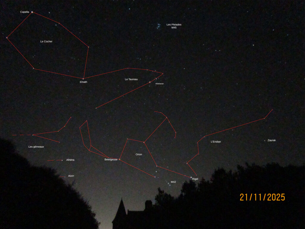 Le ciel du 21 novembre 2025 Auteur/autrice de la publication :Frere Jean-Marie Publication publiée :24 novembre 2025 Post category:Astrophotographie / ciel à l'oeil nu / constellations Commentaires de la publication :0 commentaire Jean Marie a saisi les constellations au sud sud est ,vers 22 h le 21 novembre. Une belle image qui nous rappelle que pour faire de l’astronomie,il suffit de lever les yeux au ciel Étiquettes: astronomie La Baule, astronomie presquile guérandaise, Constellation d'Orion, Constellation du Taureau, Orion Read more articles Article précédentNGC 772, galaxie asymetrique Vous devriez également aimer L’éclipse à la MJC 31 mars 2025 Rapprochement Mars-Jupiter 16 août 2024 NGC 4535, galaxie spirale 30 avril 2025 Laisser un commentaire Annuler la réponseCommentEnter your name or username to comment Enter your email address to comment Saisir l’URL de votre site (facultatif) Enregistrer mon nom, mon e-mail et mon site dans le navigateur pour mon prochain commentaire. Δ