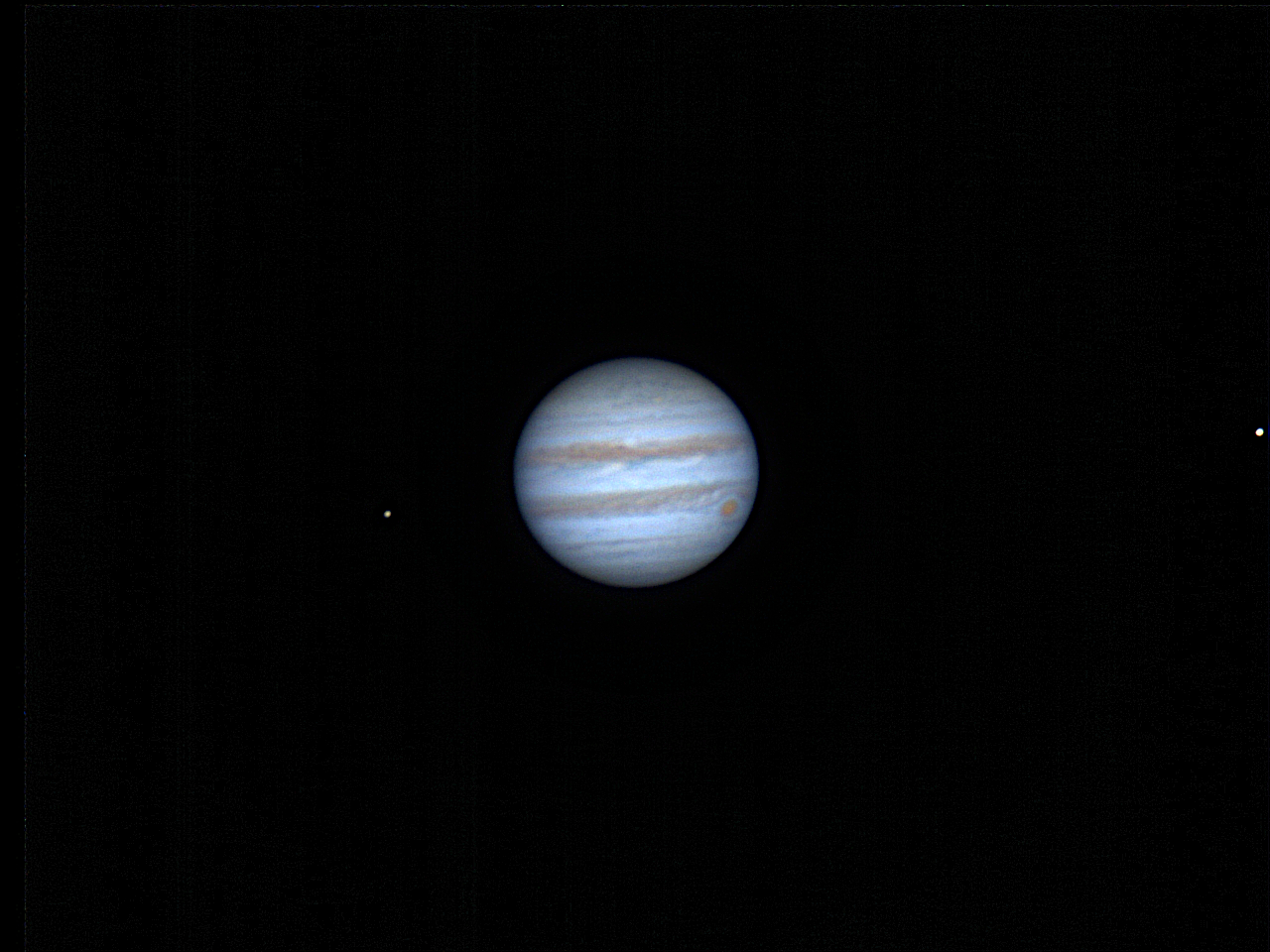 La météo défavorable de ce début d’année ne m’a pas permis de faire des images avant le 25 janvier. Une petite trouée dans les nuages et Jupiter apparaît au sud est. A 20h 47 je saisis une videos de 1000 images, pour le traitement, j’ai gardé que 500 images.